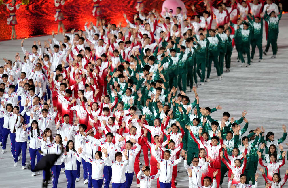 广东省体育代表团、香港特别行政区体育代表团和澳门特别行政区体育代表团在入场仪式上共同入场。新华社记者江汉摄