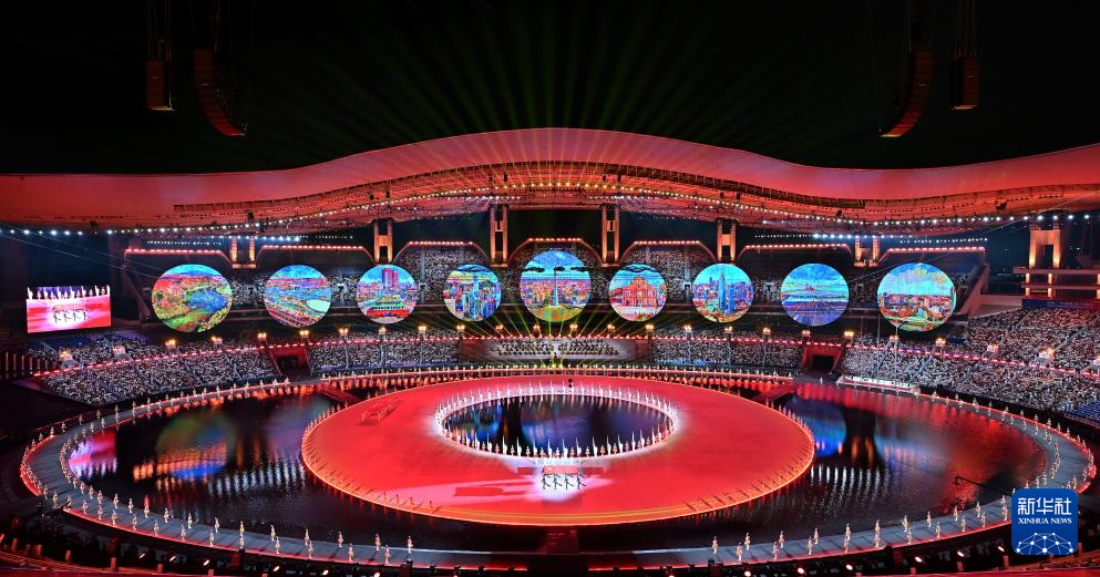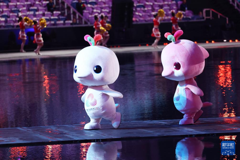 11月9日,第十五届全国运动会吉祥物“喜洋洋”和“乐融融”在开幕式现场表演。