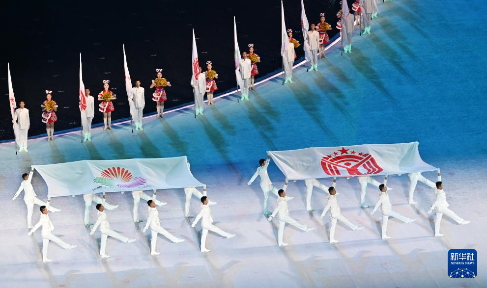 11月9日,旗手护送中华人民共和国运动会会旗和第十五届全国运动会会旗入场。