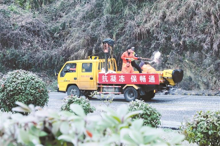 连日来,受强冷空气影响,黔东南州天柱县境内G242国道部分路段出现路面结冰,当地交警与公路段工作人员迅速启动人工与机械协同作业,开展融冰工作,全力保障道路畅通和交通安全。图为1月21日,天柱县交警与公路段工作人员在G242国道十里冲路段抛撒融雪剂。 潘存栋 张先游 摄(影像贵州)