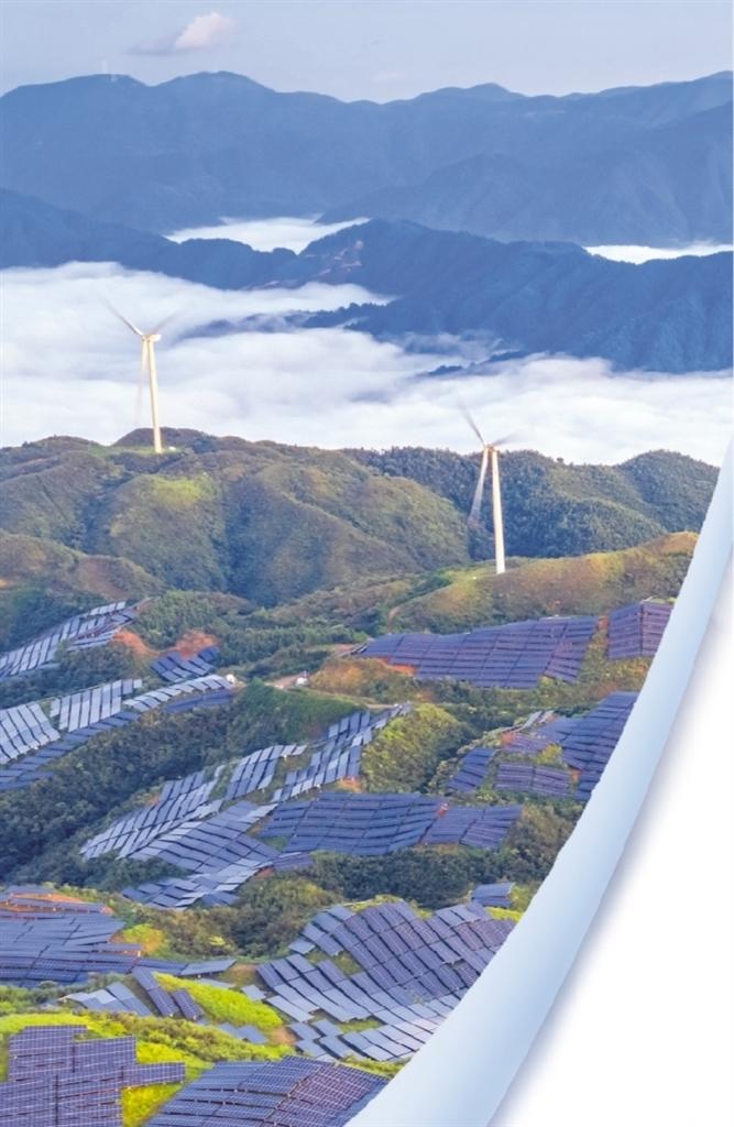 黔东南州锦屏县固本乡青山界,光伏太阳能电池板和风电机组与晨雾、远山、朝霞相映成景。 李必祥 摄(影像贵州)