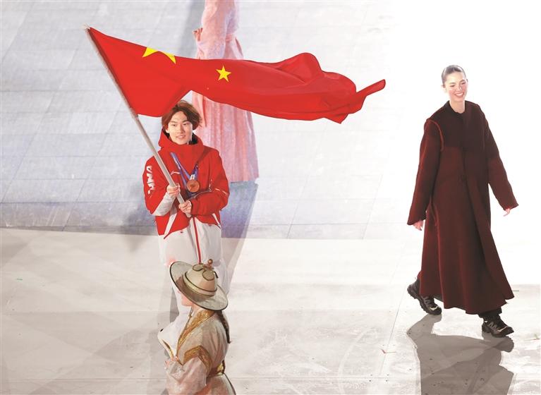 22岁的苏翊鸣作为中国体育代表团旗手,高举五星红旗入场。他在单板滑雪男子坡面障碍技巧项目为中国代表团摘得在本届赛事的首金,还夺得男子大跳台铜牌。