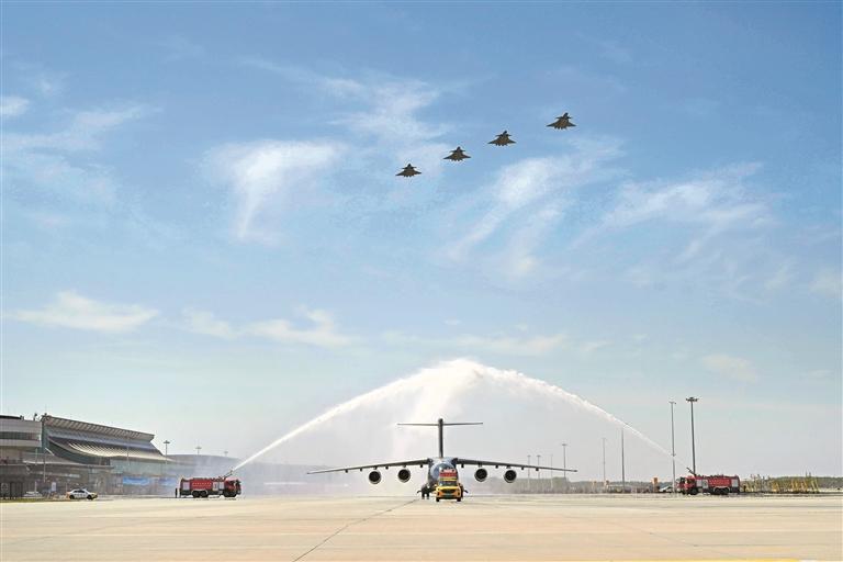 22日上午,中韩双方在韩国仁川国际机场举行志愿军烈士遗骸交接仪式。9时50分许,呼号为“荣归50”的运-20B起飞。进入中国领空后,呼号为“红鹰”的4架歼-20迎接护航,“双20”列阵长空致以崇高敬意。11时25分,运-20B平稳降落在辽宁沈阳桃仙国际机场,机场以“过水门”最高礼遇为英灵洗尘。