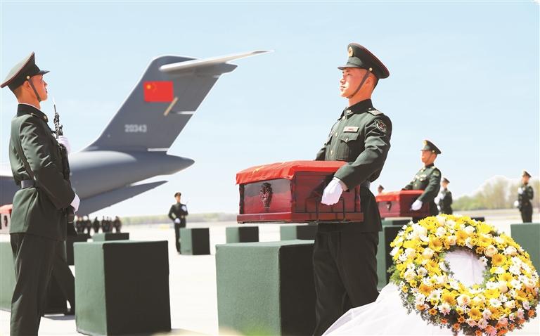 4月22日,在沈阳桃仙国际机场,礼兵将志愿军烈士遗骸棺椁从专机护送至棺椁摆放区。 新华社发