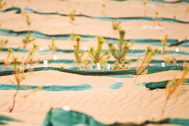 内蒙古通辽市科尔沁区大林镇科尔沁沙地治理项目区栽植在羽翼袋沙障内的樟子松。