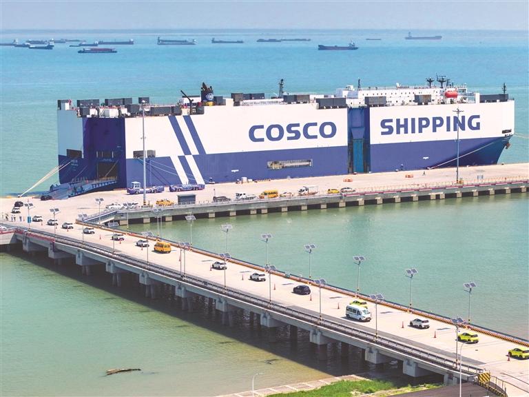 装载千余辆商品车的“玉衡先锋”号从江苏太仓港启程前往东南亚。 新华社发