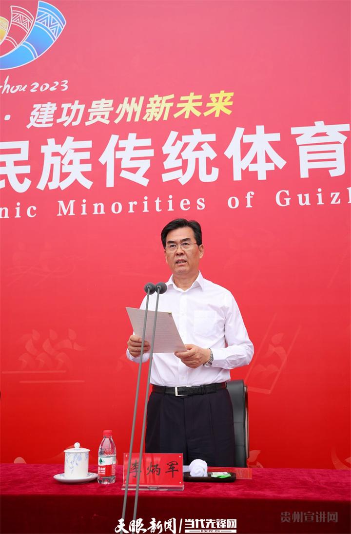 受徐麟书记委托,李炳军代表中共贵州省委、省人大常委会、省人民政府、省政协,向运动会的召开表示热烈祝贺,向出席开幕式的各位领导和嘉宾表示热烈欢迎和衷心感谢。他说,习近平总书记对贵州民族工作高度重视、对贵州各族人民关怀厚爱。省委、省政府牢记习近平总书记嘱托,团结带领全省各族干部群众,按时打赢脱贫攻坚战,加快民族地区高质量发展,努力建设铸牢中华民族共同体意识模范省。全省各民族和睦相处、亲如一家,民族团结进步之花在贵州大地常开长盛。举办少数民族传统体育运动会,是传承中华优秀传统文化、促进各民族交往交流交融、落实全民健身国家战略的重要举措。希望全体运动员、教练员、裁判员大力弘扬中华体育精神,赛出水平、赛出风格、赛出团结;希望组委会和广大工作人员热情服务、周密保障,确保本届运动会成为全省各族人民大欢聚、大交流、大团结的盛会,成为“简约、安全、特色、精彩”的盛会。当前,贵州已经踏上高质量发展、全面建设社会主义现代化的新征程。全省上下要以本届运动会为新起点,推动民族团结进步事业不断发展,汇聚各族儿女同心筑梦的磅礴伟力,奋发有为谱写中国式现代化的贵州精彩篇章。