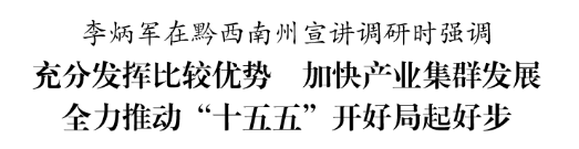 3月23日至24日,省委副书记、省长李炳军到黔西南州普安县、兴仁市、兴义市宣讲全国两会精神并调研。他强调,要深入学习贯彻习近平总书记在贵州考察时的重要讲话精神,认真落实全国两会部署,牢固树立和践行正确政绩观,坚持以高质量发展统揽全局,充分发挥比较优势,加快产业集群发展,全力推动“十五五”开好局起好步。