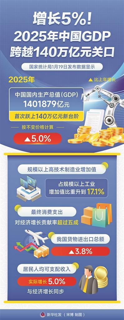 1月19日,2025年中国经济成绩单发布——国内生产总值(GDP)首次跨越140万亿元大关,比上年增长5.0%。