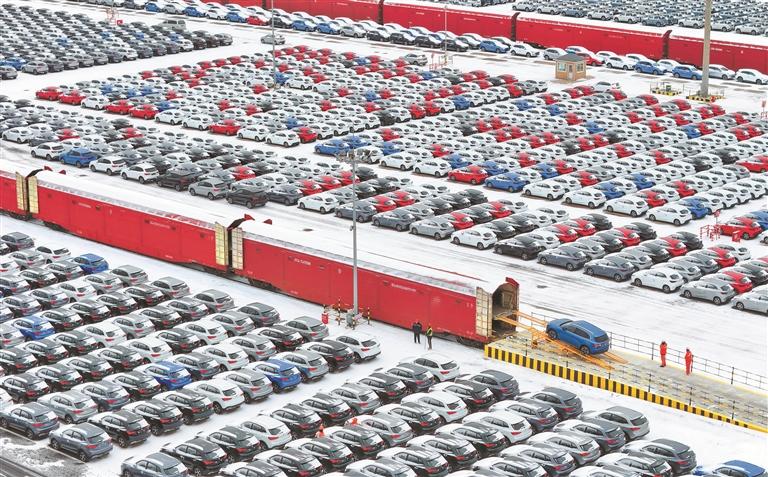 1月18日,国产汽车在烟台港码头集结,等待装船出口。