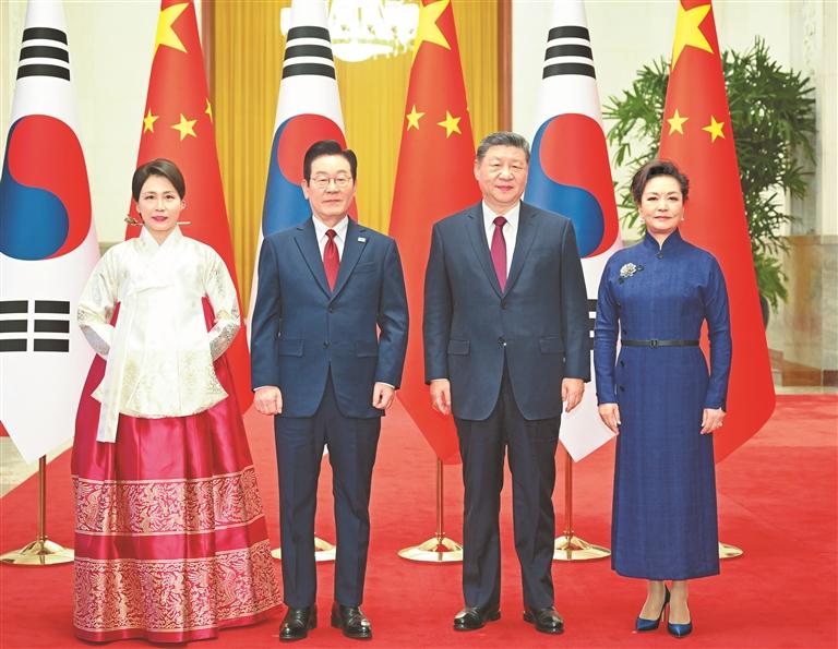 习近平指出,当前世界百年变局加速演进,国际形势更加变乱交织。中韩在维护地区和平、促进全球发展方面肩负重要责任,有广泛利益交集,应当坚定站在历史正确一边,作出正确战略选择。80多年前,中韩两国付出巨大民族牺牲,赢得抗击日本军国主义的胜利。今天更应携手捍卫二战胜利成果,守护东北亚和平稳定。作为经济全球化的受益者,中韩要共同反对保护主义,践行真正的多边主义,为推进平等有序的世界多极化、普惠包容的经济全球化作出贡献。