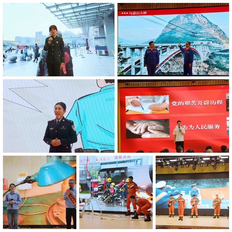 宣讲环节中,7组宣讲员依次登台,用真挚的情感、生动的讲述打动了在场每一位师生。贵州财经大学退伍大学生张阗以《三碗水见担当》为题,用“冷水、泪水、墨水”的成长故事,诠释了新时代青年“有理想、敢担当、能吃苦、肯奋斗”的精神底色;来自贵州交投集团的陈磊、王唤带来理论宣传二人讲《从万桥飞架,看中国奋斗的贵州交通实践》,从北盘江大桥到花江峡谷大桥,展现了贵州交通人攻坚克难、勇攀高峰的奋斗姿态;贵阳市公安局白云分局沙文派出所见习民警周制宜以《菜?就多练!》讲述了老一辈“铁脚板”精神与新时代“大数据”智慧在公安队伍中的传承与创新;贵阳市花溪区发改局的郝建东通过《我要握住你的手》,用老红军的断腕与新时代农妇的双手,勾勒出中国共产党百年奋斗的温暖缩影;贵州航天电子科技有限公司的陈斌、王一霖以《小锉刀·大工匠》,展现了航天人二十年如一日打磨大国重器的匠心坚守;贵阳市观山湖区消防大队的朱先进、李锦楷带来《洪流中的平安符》,道出了消防员“只要人民需要,我们一直在”的庄严承诺;最后,观山湖区消防大队沧蓝乐队演唱的《蓝》《我都在》,将整场活动推向高潮,歌声里的热血与担当让现场观众热泪盈眶。