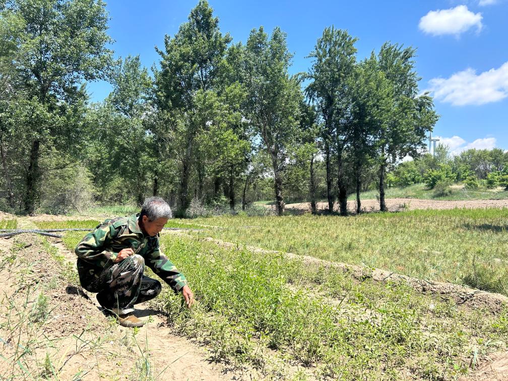 辽宁省阜新市彰武县四合城镇刘家村村民侯贵正在拔除影响枸杞苗生长的杂草(2025年6月4日摄)。新华社记者 高爽 摄