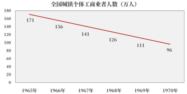 从劳动力要素来看,1965至1970年,全国城镇个体工商业者人数逐年下降,如下图所示: