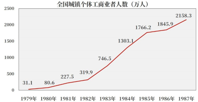 1979至1987年,全国城镇个体工商业从业人员逐年上升,如下图所示: