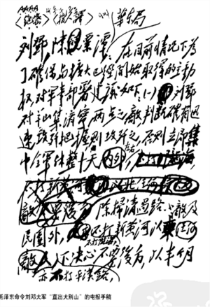 这张4A级绝密电报就是当时的一个典范,是毛泽东同志亲自起草的:“刘邓,陈饶粟谭,并华东局。在目前情况下,为了确保与扩大已经开始取得的主动权,对军事部署建议如下……”为什么叫建议呢?毛泽东同志曾表示,我对于你们不遥制,给予你们最大的主动性和灵活性,让你们根据战场的情况作出最终的决定。这就是中国共产党自上而下的指挥系统特点。