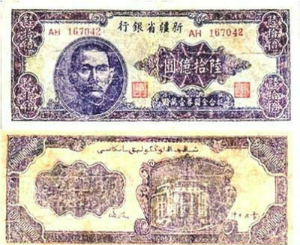 这是国共内战时期新疆省银行发行的一套货币,它的最高面值达到了六十亿元,同时还有三十亿、二十亿、十亿、五亿的面额,六十亿能干什么?在当时也就只能买几十粒大米。这就解释了为什么那个时候很多人出去买东西都是扛着麻袋。麻袋不是装东西,而是装纸币用的。由此可见,那个时候的国民党统治区民众吃饭都是很大的问题。