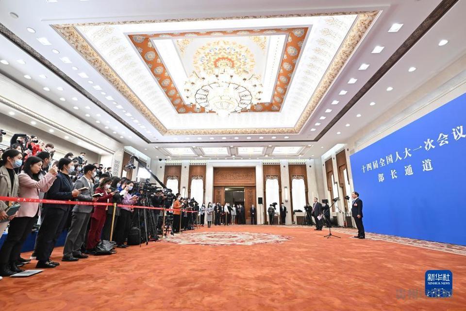 3月5日,第十四届全国人民代表大会第一次会议举行首场“部长通道”采访活动。这是工业和信息化部部长金壮龙接受媒体采访。