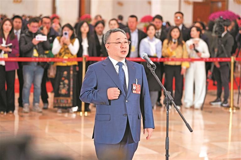 3月11日,全国政协委员、民盟贵州省委副主委、贵州民族大学副校长崔海洋在第三场“委员通道”上。 贵州日报天眼新闻记者 贾智 摄