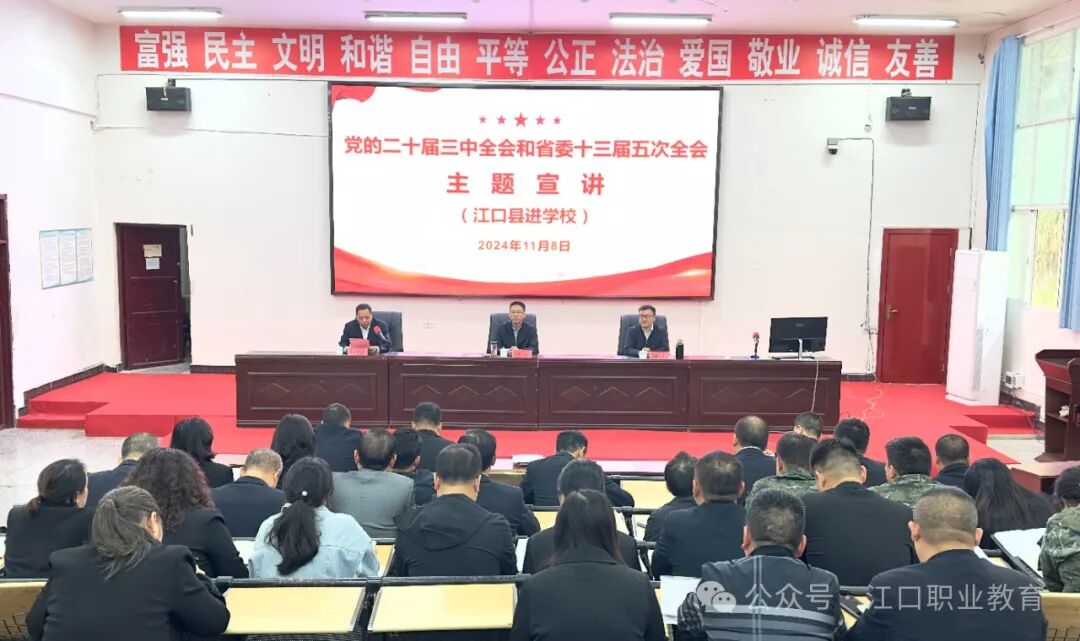为学习贯彻党的二十届三中全会精神,根据《全省党校(行政学院、讲师团)系统学习贯彻党的二十届三中全会精神宣讲活动方案》要求,11月7日—8日,省委党校、省委讲师团到江口县开展“理论宣传二人讲”省市县联动宣讲工作。11月8日上午,省委党校、省委讲师团走进江口县中等职业学校,开展党的二十届三中全会和省委十三届五次全会主题宣讲。宣讲会由江口县中等职业学校党支部书记、校长杨秀华主持。