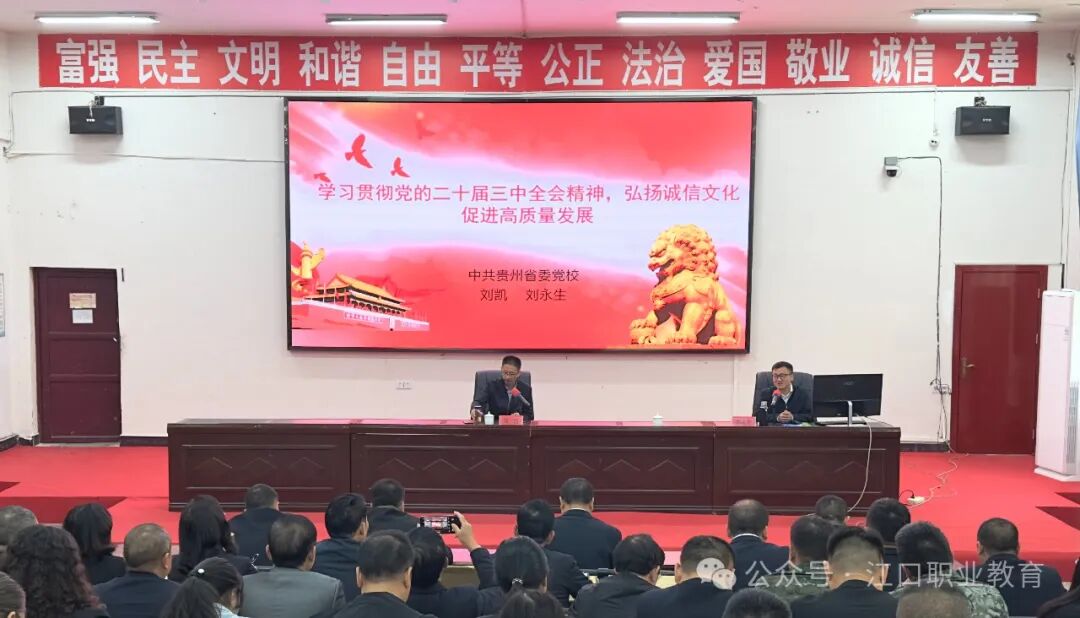 宣讲会上,中共贵州省委党校刘永生、刘凯同志以《学习贯彻党的二十届三中全会精神 弘扬诚信文化促进高质量发展》为主题,围绕“党的二十届三中全会基本情况、习近平总书记在党的二十届三中全会上的重要讲话精神、全面准确理解《决定》提出的进一步全面深化改革重大举措、全力以赴抓好全会精神贯彻落实”四个部分作了全面系统讲解和深入阐释。刘永生、刘凯同志的宣讲主题鲜明、站位高远、脉络清晰、阐释精练,既有理论的高度,又有思想的深度,宣讲精准、内容详实。进一步增强了学校全体党员干部投身教育事业的积极性,为学校的后续工作提供了有力指引和强劲动力。