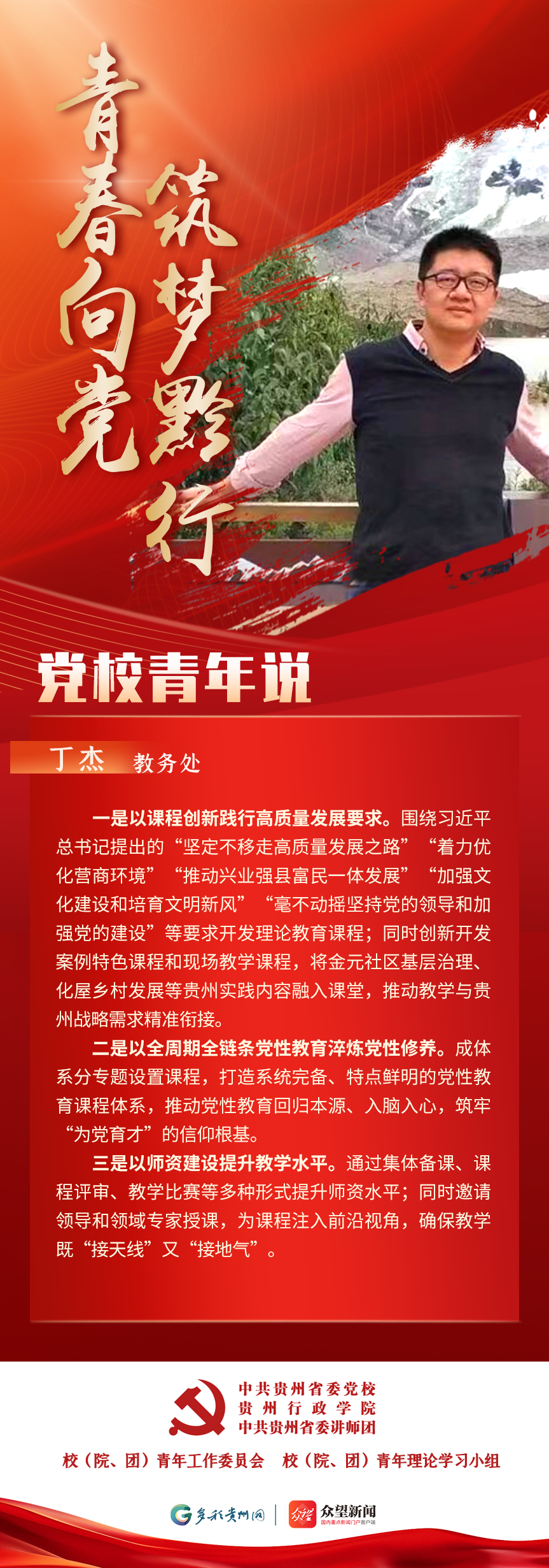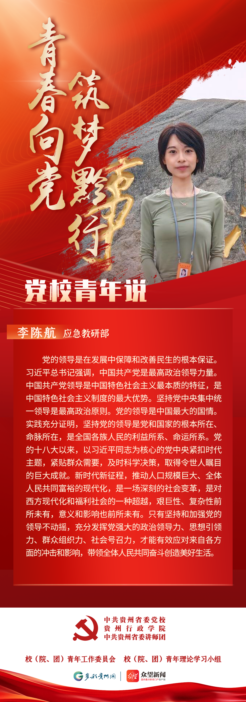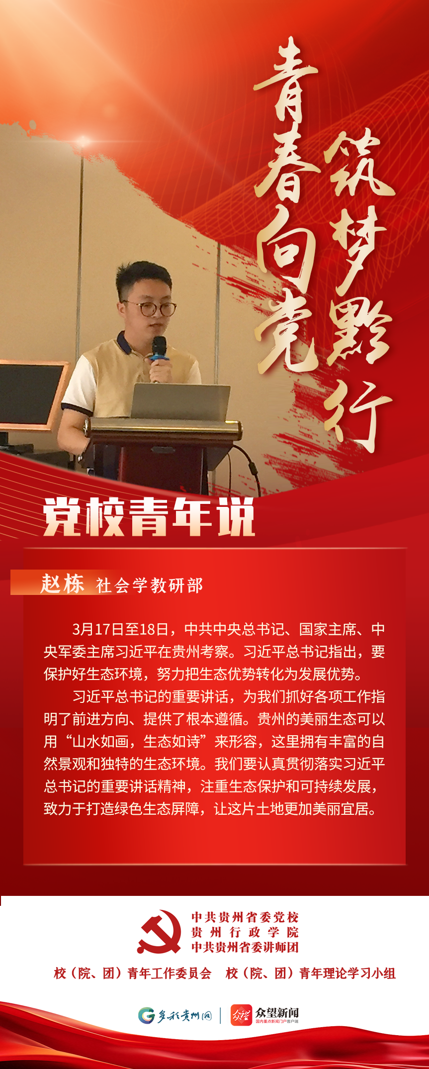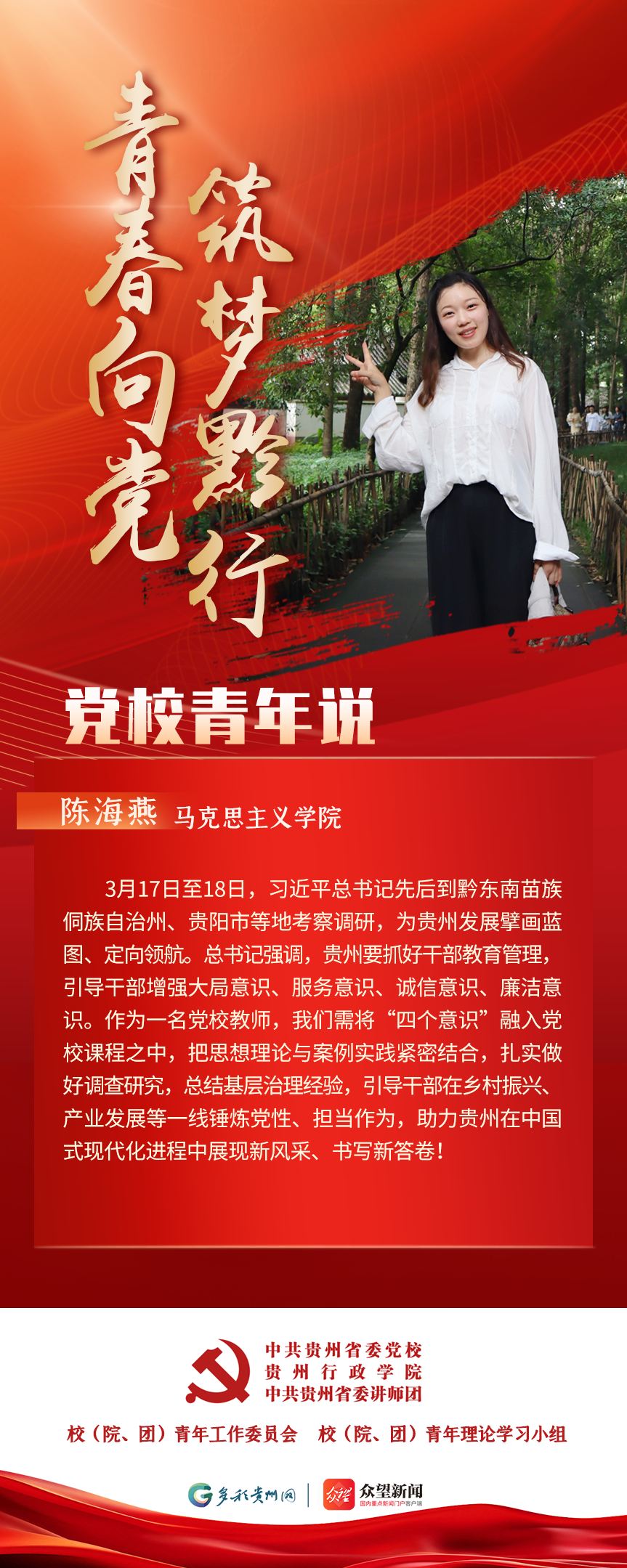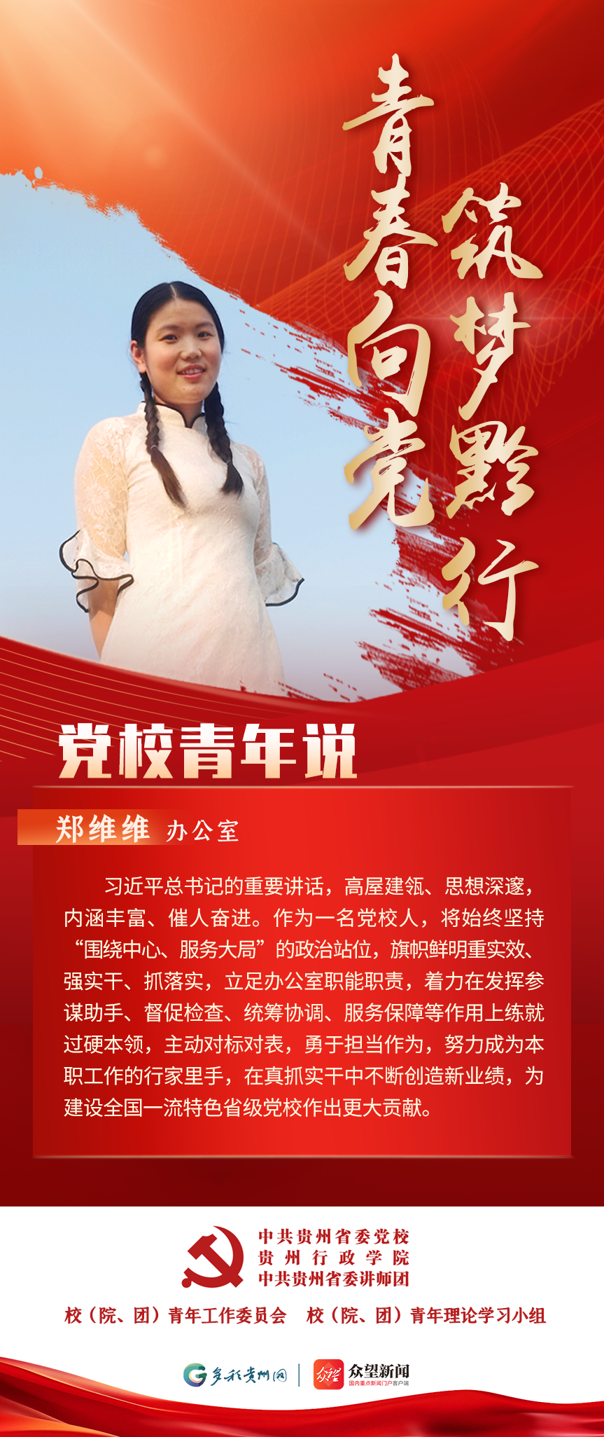为深入学习贯彻习近平总书记关于青年工作的重要思想,充分发挥党校理论主阵地的引领作用,积极构建党校青年自我展示与相互交流平台,凝聚青年力量,激励党校青年当好全省践行“两个维护”第一方阵青年排头兵,特开设“青春向党 筑梦黔行 党校青年说”系列学习专栏。