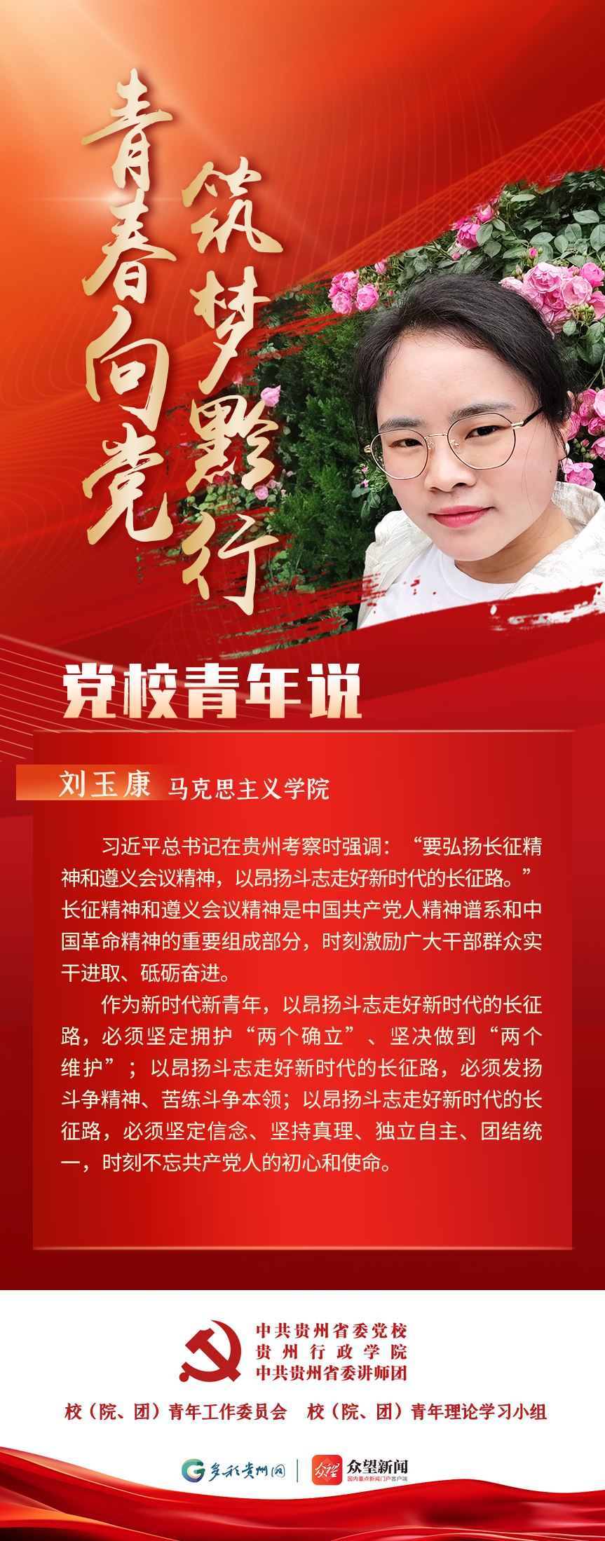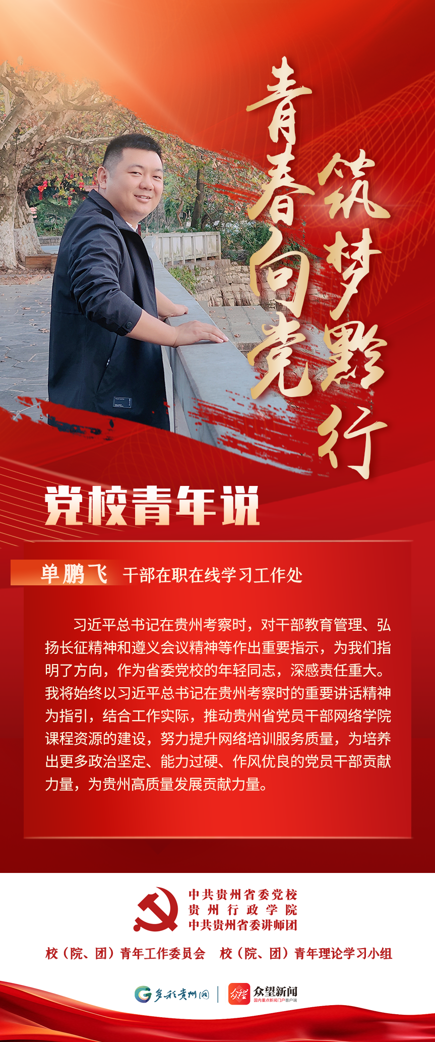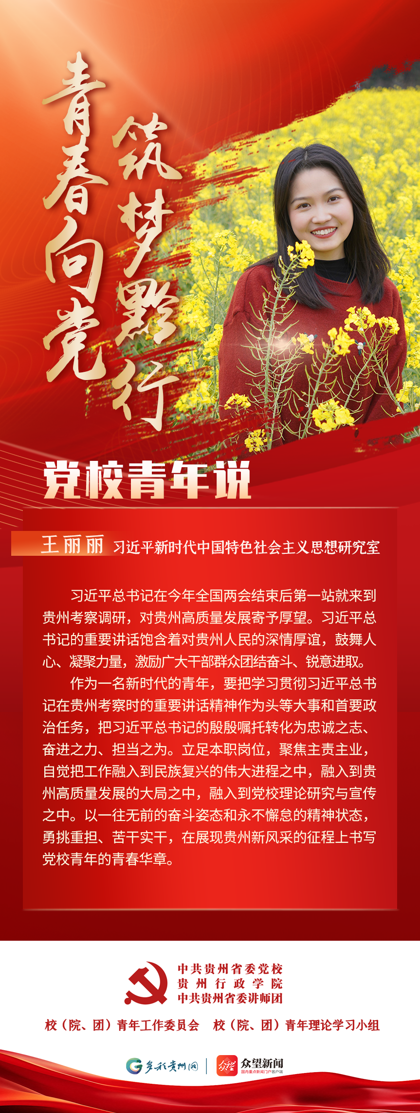 为深入学习贯彻习近平总书记关于青年工作的重要思想,充分发挥党校理论主阵地的引领作用,积极构建党校青年自我展示与相互交流平台,凝聚青年力量,激励党校青年当好全省践行“两个维护”第一方阵青年排头兵,特开设“青春向党 筑梦黔行 党校青年说”系列学习专栏。
