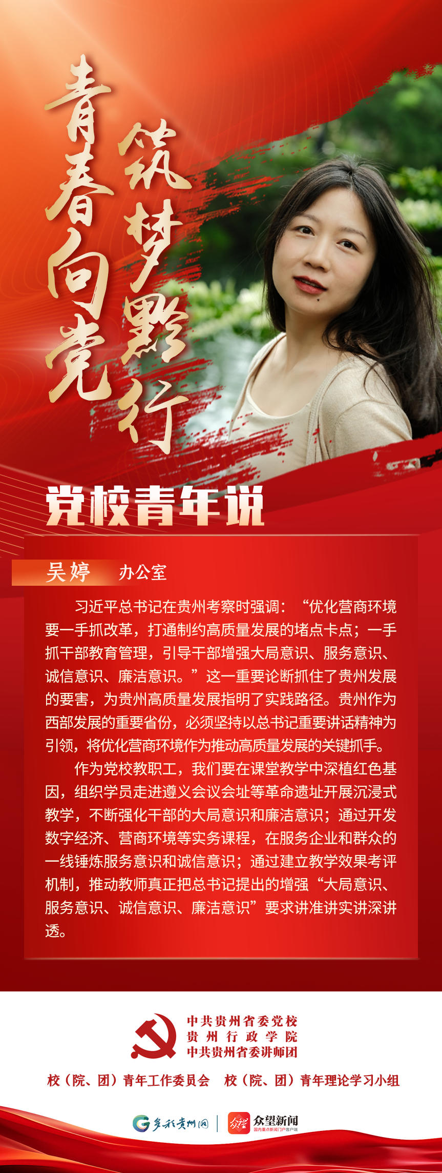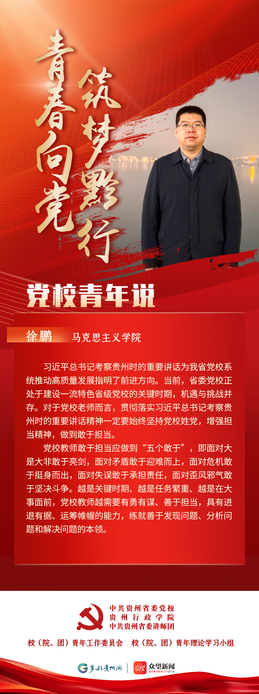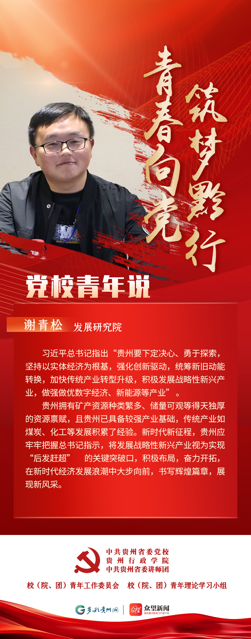 为深入学习贯彻习近平总书记关于青年工作的重要思想,充分发挥党校理论主阵地的引领作用,积极构建党校青年自我展示与相互交流平台,凝聚青年力量,激励党校青年当好全省践行“两个维护”第一方阵青年排头兵,特开设“青春向党 筑梦黔行 党校青年说”系列学习专栏。