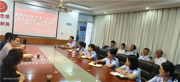 6月25日,安顺市税务局机关第十四支部、普定县税务局第二分局支部联合开展“党建引领提质效 业务融合谋发展”主题党日活动,共15名党员参加。