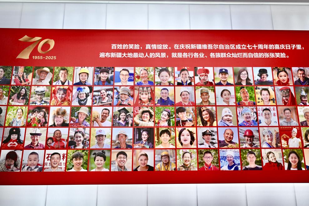 葡萄架上果实累累,农民笑得那么甜蜜;戴着雷锋帽奋战在冰天雪地,工人笑得那么炽热;青年人身着民族盛装欢快起舞,笑得那么自信;孩子们迎着阳光自由嬉戏,笑得那么天真……这是新疆维吾尔自治区成立70周年主题成就展的一面笑脸墙。