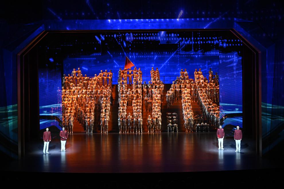 24日的文艺晚会《美丽新疆》中,创意诗舞画《时代交响》,以绚丽变幻的声光电,生动描绘天山南北的日新月异。